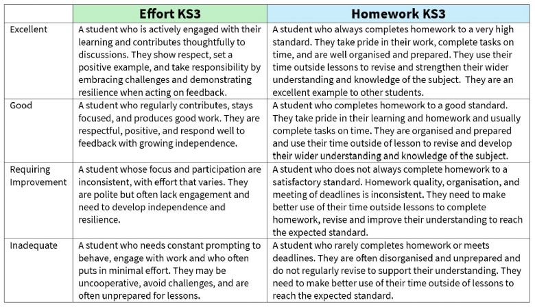 A student’s effort, behaviour, and completion of homework have a direct impact on their attainment. Students are therefore expected to put maximum effort into all aspects of their learning. Each Progress Check reports on the following areas for every subject: